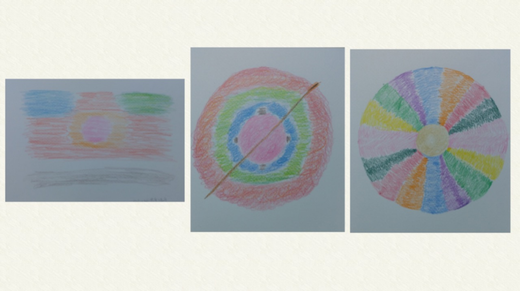 ◉最初の絵に上下の2分があり、2枚目では斜めの線でこの2区分が表現されています。 3枚目ではそれらの区分がなくなり、すべての色が放射状に広がるように描かれています。
